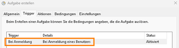 Ich hatte eine einfache Aufgabe auf meinem Computer in der Aufgabenplanung erstellt. Diese hat dort auch einwandfrei funktioniert und wurde zu den gewünschten Zeiten bzw. durch die gewünschten Trigger ausgeführt. Deshalb hatte es mich gewundert, dass dieser geplante Task auf einem Notebook, als ich ihn dort importiert habe, so gut wie nie funktioniert hat und einfach nicht ausgeführt worden ist. Und das obwohl es ein ganz einfacher Trigger gewesen ist, wie beispielsweise „Bei Anmeldung eines Benutzers“: